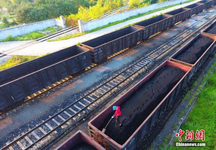 資料圖:工人整理貨物列車上的電煤。 胡國林 攝