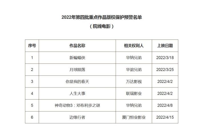 2022第四批重點作品版權保護預警名單(院線電影)公布