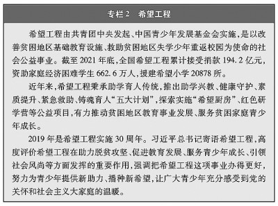 教育機(jī)會(huì)更加均等。中國(guó)教育事業(yè)優(yōu)先發(fā)展不斷深化,中國(guó)青年享有更加平等、更高質(zhì)量的教育機(jī)會(huì)。2021年,中國(guó)義務(wù)教育鞏固率達(dá)95.4%;高中階段毛入學(xué)率達(dá)91.4%;高等教育毛入學(xué)率達(dá)57.8%、在學(xué)總規(guī)模達(dá)4430萬(wàn)人,居世界第一,越來(lái)越多的青年打開(kāi)了通往成功成才大門的重要路徑。覆蓋學(xué)前教育至研究生教育的學(xué)生資助政策體系建成且日趨完善,2020年資助資金總額超過(guò)2400億元、資助學(xué)生近1.5億人次,實(shí)現(xiàn)“三個(gè)全覆蓋”②。義務(wù)教育階段進(jìn)城務(wù)工人員隨遷子女、農(nóng)村和貧困地區(qū)學(xué)生等群體受教育權(quán)益得到充分保障。2020年,85.8%的進(jìn)城務(wù)工人員隨遷子女在公辦學(xué)校就讀或享受政府購(gòu)買學(xué)位服務(wù);2012年至2021年,農(nóng)村和貧困地區(qū)重點(diǎn)高校專項(xiàng)招生計(jì)劃定向招生超過(guò)82萬(wàn)人,讓更多的青年公平享有接受更好教育的機(jī)會(huì),阻斷貧困的代際傳遞。