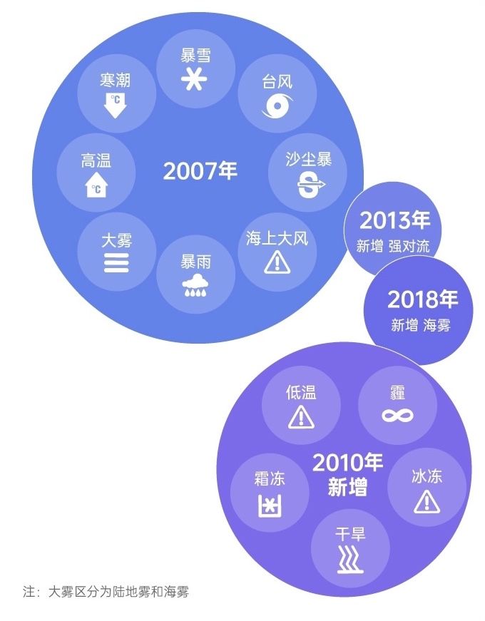 2007年,中國(guó)氣象局制定并發(fā)布《中央氣象臺(tái)氣象災(zāi)害警報(bào)發(fā)布辦法(試行)》,適用于8類(lèi)氣象災(zāi)害預(yù)警;2010年,氣象災(zāi)害預(yù)警增至13類(lèi);2013年新增強(qiáng)對(duì)流預(yù)警發(fā)布辦法,至此氣象災(zāi)害預(yù)警增至14類(lèi)。2018年,在大霧氣象災(zāi)害預(yù)警中還新增了海霧預(yù)警發(fā)布辦法。