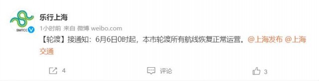 據(jù)上海市交通委員會交通指揮中心官方微博@樂行上海 消息,接通知:6月6日0時起,本市輪渡所有航線恢復正常運營。