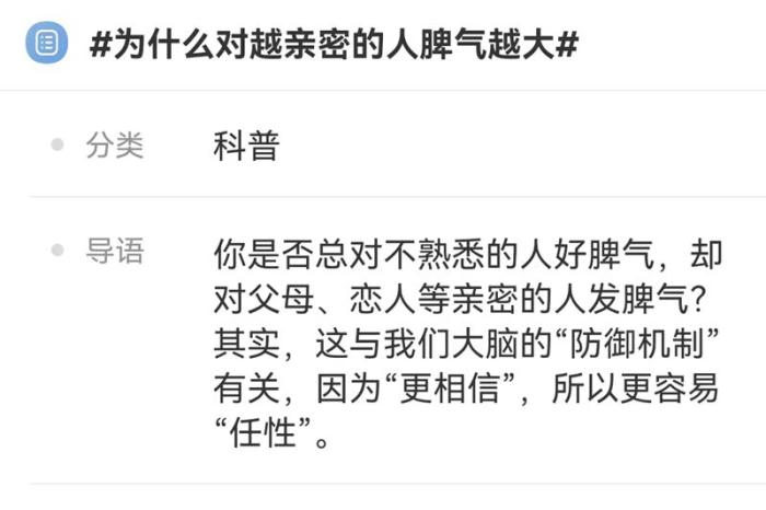 心理咨詢師楊琳瓊分析,潛意識(shí)中,我們知道對(duì)親近的人發(fā)脾氣會(huì)遭遇什么,這個(gè)風(fēng)險(xiǎn)是可以接受的,并且這種親密關(guān)系不會(huì)因此而摧毀。