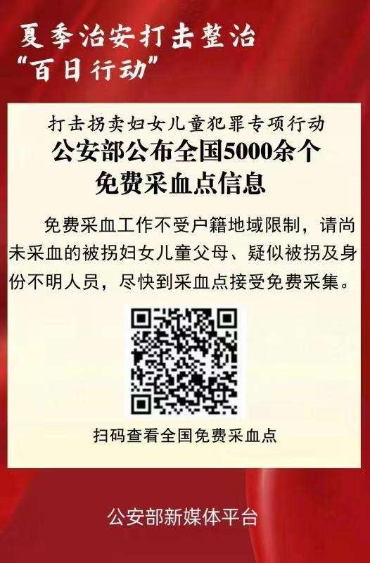 公安部公布全國5000余個(gè)免費(fèi)采血點(diǎn)信息 助力被拐家庭早日實(shí)現(xiàn)團(tuán)圓 免費(fèi)采血工作不受戶籍地域限制