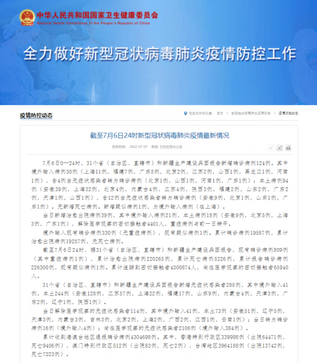 7月6日0—24時,31個?。ㄗ灾螀^(qū)、直轄市)和新疆生產建設兵團報告新增確診病例124例。其中境外輸入病例30例(上海11例,福建7例,廣東5例,北京2例,江蘇2例,山西1例,黑龍江1例,河南1例),含4例由無癥狀感染者轉為確診病例(北京1例,山西1例,河南1例,廣東1例);本土病例94例(安徽39例,上海32例,北京4例,內蒙古4例,江蘇4例,陜西3例,福建2例,山東2例,廣東2例,天津1例,山西1例),含12例由無癥狀感染者轉為確診病例(安徽9例,北京1例,山東1例,廣東1例)。無新增死亡病例。新增疑似病例1例,為境外輸入病例(在上海)。