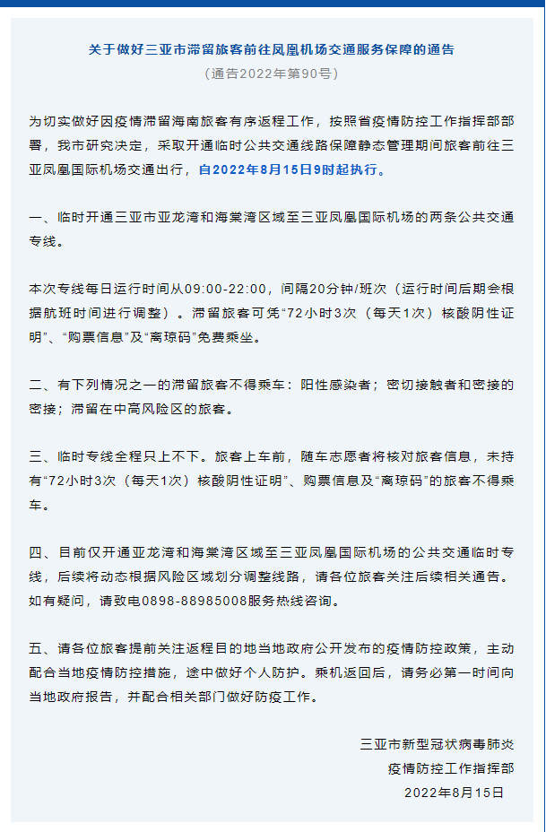 8月15日,海南三亞市新型冠狀病毒肺炎疫情防控工作指揮部發(fā)布通告,開通滯留旅客前往鳳凰機場公交專線,詳情如下: