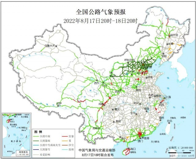 8月17日20時(shí)至18日20時(shí),內(nèi)蒙古中部偏南地區(qū)、遼寧西部、青海東部、甘肅中東部、寧夏、陜西北部、山西北部、河北中北部、北京、天津、廣東西南部等地部分地區(qū)有中到大雨,其中,內(nèi)蒙古中部偏南地區(qū)、陜西北部、山西北部、河北東北部、北京北部、天津北部等地部分地區(qū)有暴雨,內(nèi)蒙古中部偏南地區(qū)、山西北部等地部分地區(qū)有大暴雨。河北中南部、黑龍江西北部和南部、浙江西部和東北部、廣東中部、廣西東南部、海南島大部、四川中部、西藏東北部、寧夏南部等地局地有雷暴。另外,遼寧東部、吉林中東部、福建東部、廣西東南部、云南東北部等地局地有霧。受大到暴雨影響的主要路段有: