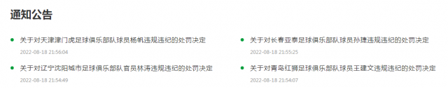 18日晚,中國(guó)足協(xié)網(wǎng)站發(fā)布4則球員、俱樂部官員違規(guī)違紀(jì)的處罰決定,中超天津津門虎球員楊帆、中超長(zhǎng)春亞泰球員孫捷及中乙青島紅獅球員王建文均停賽5場(chǎng),中甲遼寧沈陽(yáng)城市足球俱樂部官員林濤6場(chǎng)比賽禁止進(jìn)入體育場(chǎng)。處罰決定全文如下: