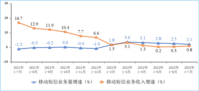 移動電話通話量小幅增長,移動短信業(yè)務(wù)收入增速回升。1—7月份,移動電話去話通話時長完成1.32萬億分鐘,同比增長1.1%;固定電話主叫通話時長完成483.5億分鐘,同比下降11.8%。1—7月份,全國移動短信業(yè)務(wù)量同比增長2.1%,移動短信業(yè)務(wù)收入同比增長0.8%,增速較上半年分別回落0.4個和提升0.5個百分點。