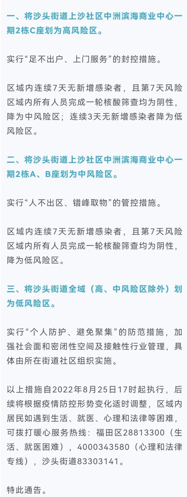 8月25日,廣東省深圳市福田區(qū)新型冠狀病毒肺炎疫情防控指揮部發(fā)布通告稱,根據(jù)當前福田區(qū)疫情防控工作需要,按照國務(wù)院應(yīng)對新型冠狀病毒肺炎疫情聯(lián)防聯(lián)控機制綜合組《新型冠狀病毒肺炎疫情防控方案(第九版)》和《廣東省新冠肺炎本地疫情應(yīng)急處置方案(第五版)》相關(guān)規(guī)定,經(jīng)專家組研判,自2022年8月25日起,福田區(qū)在沙頭街道劃定高風(fēng)險區(qū)、中風(fēng)險區(qū)、低風(fēng)險區(qū)如下: