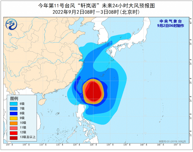 大風(fēng)預(yù)報(bào):9月2日08時(shí)至3日08時(shí),巴士海峽、臺(tái)灣海峽、臺(tái)灣以東洋面、東海大部及釣魚島附近海域、長江口區(qū)、杭州灣,以及臺(tái)灣島北部和東部沿海、福建中北部沿海、浙江沿海、上海沿海、江蘇南部沿海將有6-8級(jí)大風(fēng),陣風(fēng)9-10級(jí),其中臺(tái)灣以東洋面的風(fēng)力有9-12級(jí),陣風(fēng)11-15級(jí),“軒嵐諾”中心經(jīng)過的附近海面的風(fēng)力有13-15級(jí),陣風(fēng)可達(dá)16-17級(jí)。