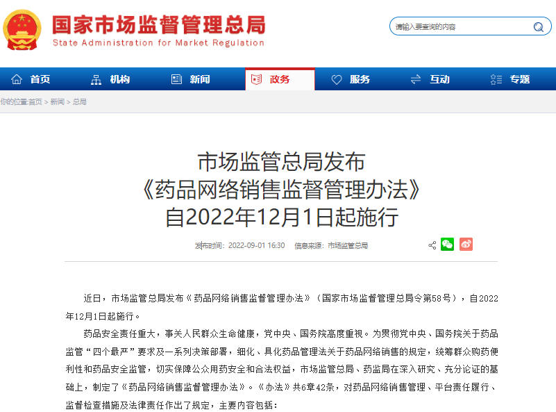 近日,市場(chǎng)監(jiān)管總局發(fā)布《藥品網(wǎng)絡(luò)銷售監(jiān)督管理辦法》(國(guó)家市場(chǎng)監(jiān)督管理總局令第58號(hào)),自2022年12月1日起施行。
