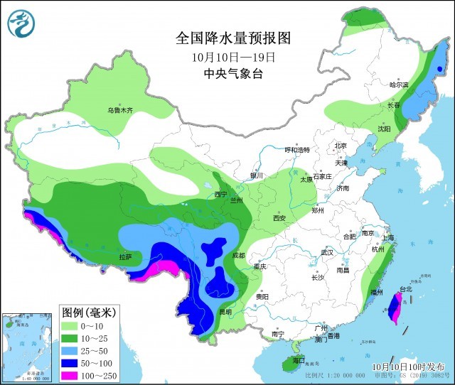 未來10天(10月10-19日),青藏高原東部和南部、四川盆地西部、云南西部和北部、貴州西北部、華南東部等地累計降水量有30~50毫米,部分地區(qū)有60~110毫米;上述地區(qū)累計降雨量較常年同期偏多5~8成,局地偏多1倍以上。黃淮、江淮、江南大部、華南大部多晴到多云天氣。