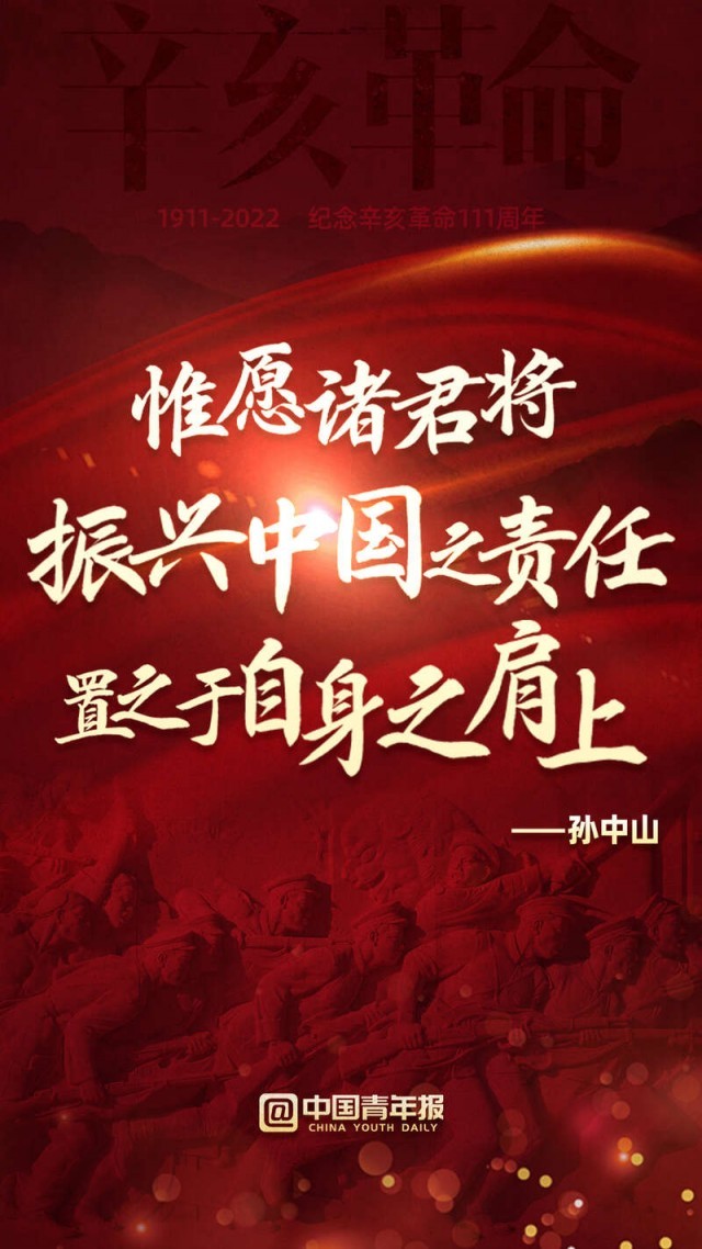 111年前,以孫中山先生為代表的革命黨人發(fā)動(dòng)了辛亥革命,近代以來中國(guó)發(fā)生的深刻社會(huì)變革由此拉開新的一幕。今天,讓我們學(xué)習(xí)和弘揚(yáng)革命先驅(qū)為振興中華而矢志不渝的崇高精神,為實(shí)現(xiàn)中華民族偉大復(fù)興而共同奮斗!
