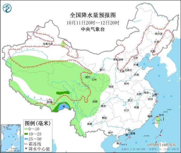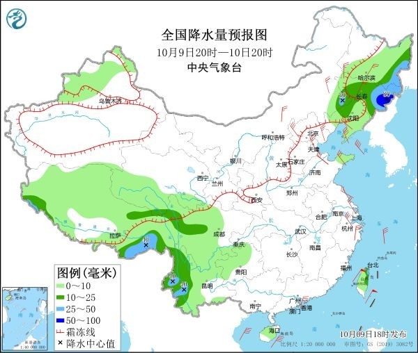 10月9日20時(shí)至10日20時(shí),內(nèi)蒙東南部、遼寧西部和北部、吉林東南部等地有小到中雪或雨夾雪,局部有大雪或暴雪。內(nèi)蒙古東南部、黑龍江東部、吉林大部、遼寧西北部、西藏西南部和東部、云南西部等地部分地區(qū)有中到大雨,其中,吉林東部等地局地有暴雨(50~80毫米)。內(nèi)蒙古中東部、黑龍江西南部、吉林西部、遼寧、河北北部、天津、山東半島、江蘇東部、浙江中北部等地部分地區(qū)有4~6級風(fēng),陣風(fēng)7~8級(見圖2)。渤海、渤海海峽、黃海大部、東海西部、臺灣海峽、臺灣以東洋面、巴士海峽、南海北部、北部灣將有8~9級、陣風(fēng)10~11級的大風(fēng)。