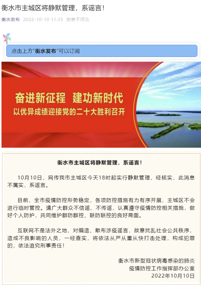 據“衡水發(fā)布”微信公眾號消息,衡水市新型冠狀病毒感染的肺炎疫情防控工作指揮部辦公室表示,10月10日,網傳衡水市主城區(qū)今天18時起實行靜默管理,經核實,此消息不屬實,系謠言。
