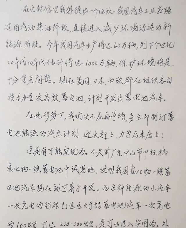 信中說,“在此形勢(shì)下,我們絕不應(yīng)再等待,要立即制訂蓄電池能源的汽車計(jì)劃,迎頭趕上,力爭后來居上?!?/p>