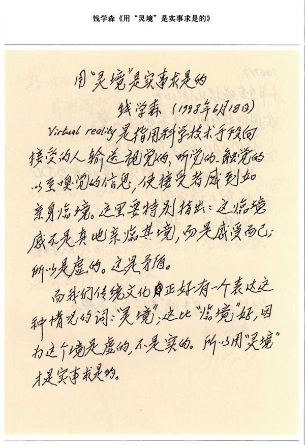 1998年6月18日,87歲的錢學(xué)森寫了一篇短文《用“靈境”是實(shí)事求是的》,其中寫道:“我們傳統(tǒng)文化正好有一個(gè)表達(dá)這種情況的詞‘靈境’;這比‘臨境’好,因?yàn)檫@個(gè)境是虛的,不是實(shí)的?!?/p>