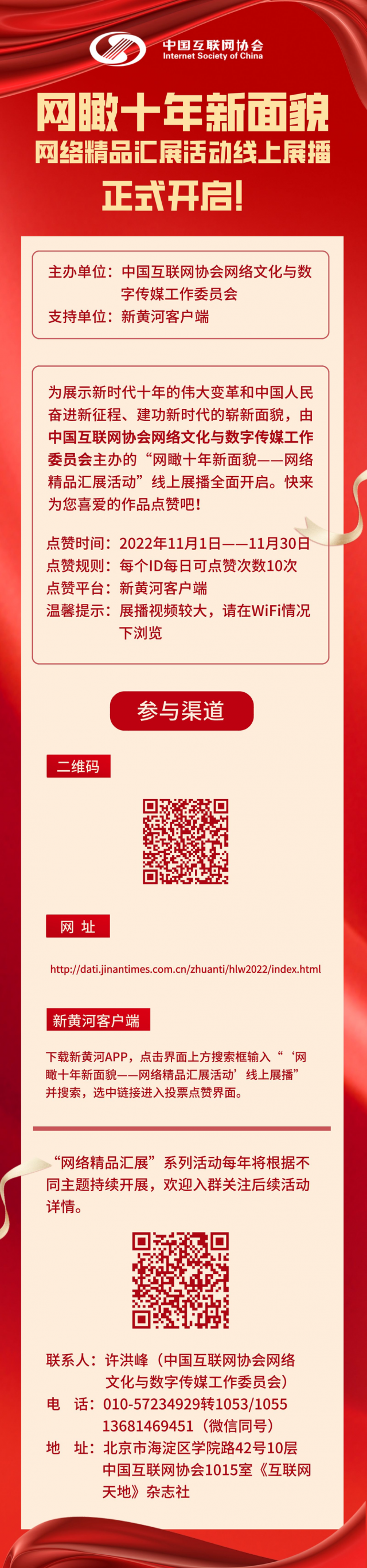 為展示新時(shí)代十年的偉大變革和中國(guó)人民奮進(jìn)新征程、建功新時(shí)代的嶄新面貌,11月1日,由中國(guó)互聯(lián)網(wǎng)協(xié)會(huì)網(wǎng)絡(luò)文化與數(shù)字傳媒工作委員會(huì)(以下簡(jiǎn)稱工作委員會(huì))主辦的“網(wǎng)絡(luò)精品匯展”第三季“網(wǎng)瞰十年新面貌”網(wǎng)絡(luò)精品匯展活動(dòng)線上展播啟動(dòng),在網(wǎng)絡(luò)空間唱響正能量。歡迎廣大網(wǎng)民點(diǎn)擊“閱讀原文”進(jìn)入活動(dòng)頁面為喜愛的作品點(diǎn)贊,展播時(shí)間截至11月30日。