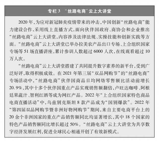 “絲路電商”合作成果豐碩。自2016年以來(lái),中國(guó)與五大洲23個(gè)國(guó)家建立雙邊電子商務(wù)合作機(jī)制,建立中國(guó)-中東歐國(guó)家、中國(guó)-中亞五國(guó)電子商務(wù)合作對(duì)話機(jī)制,通過(guò)政企對(duì)話、聯(lián)合研究、能力建設(shè)等推動(dòng)多層次交流合作,營(yíng)造良好發(fā)展環(huán)境,構(gòu)建數(shù)字合作格局。電子商務(wù)企業(yè)加速“出?!?,帶動(dòng)跨境物流、移動(dòng)支付等各領(lǐng)域?qū)崿F(xiàn)全球發(fā)展。積極參與世界貿(mào)易組織、二十國(guó)集團(tuán)、亞太經(jīng)合組織、金磚國(guó)家、上合組織等多邊和區(qū)域貿(mào)易機(jī)制下的電子商務(wù)議題討論,與自貿(mào)伙伴共同構(gòu)建高水平數(shù)字經(jīng)濟(jì)規(guī)則。電子商務(wù)國(guó)際規(guī)則構(gòu)建取得突破,區(qū)域全面經(jīng)濟(jì)伙伴關(guān)系協(xié)定電子商務(wù)章節(jié)成為目前覆蓋區(qū)域最廣、內(nèi)容全面、水平較高的電子商務(wù)國(guó)際規(guī)則。