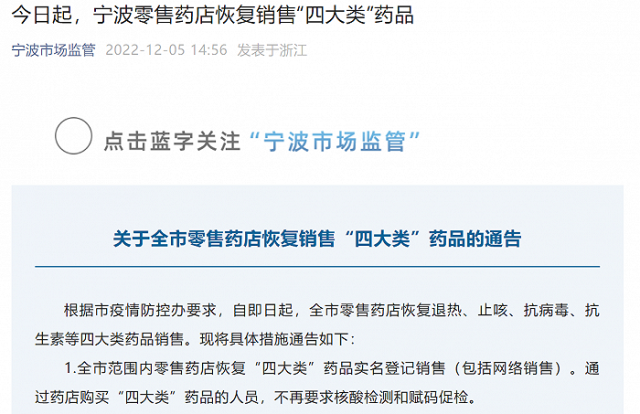 寧波市市場(chǎng)監(jiān)督管理局12月5日在其官方微信公眾號(hào)上發(fā)布通告,根據(jù)市疫情防控辦要求,自即日起,全市零售藥店恢復(fù)退熱、止咳、抗病毒、抗生素等四大類藥品銷售。現(xiàn)將具體措施通告如下: