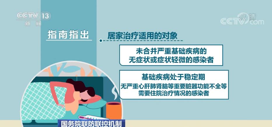 指南指出,居家治療適用的對象是:未合并嚴重基礎(chǔ)疾病的無癥狀或癥狀輕微的感染者;基礎(chǔ)疾病處于穩(wěn)定期,無嚴重心肝肺腎腦等重要臟器功能不全等需要住院治療情況的感染者。