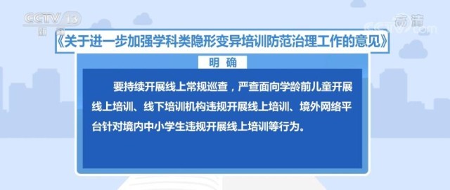 《意見》明確,要持續(xù)開展線上常規(guī)巡查,嚴(yán)查面向?qū)W齡前兒童開展線上培訓(xùn)、線下培訓(xùn)機(jī)構(gòu)違規(guī)開展線上培訓(xùn)、境外網(wǎng)絡(luò)平臺(tái)針對(duì)境內(nèi)中小學(xué)生違規(guī)開展線上培訓(xùn)等行為。