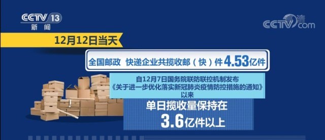 國家郵政局?jǐn)?shù)據(jù)顯示,12月1日—12日,郵政快遞行業(yè)攬收量約為43.03億件,同比上升5.6%。12月12日當(dāng)天,全國郵政、快遞企業(yè)共攬收郵(快)件4.53億件。自12月7日國務(wù)院聯(lián)防聯(lián)控機(jī)制發(fā)布《關(guān)于進(jìn)一步優(yōu)化落實新冠肺炎疫情防控措施的通知》以來,單日攬收量保持在3.6億件以上。