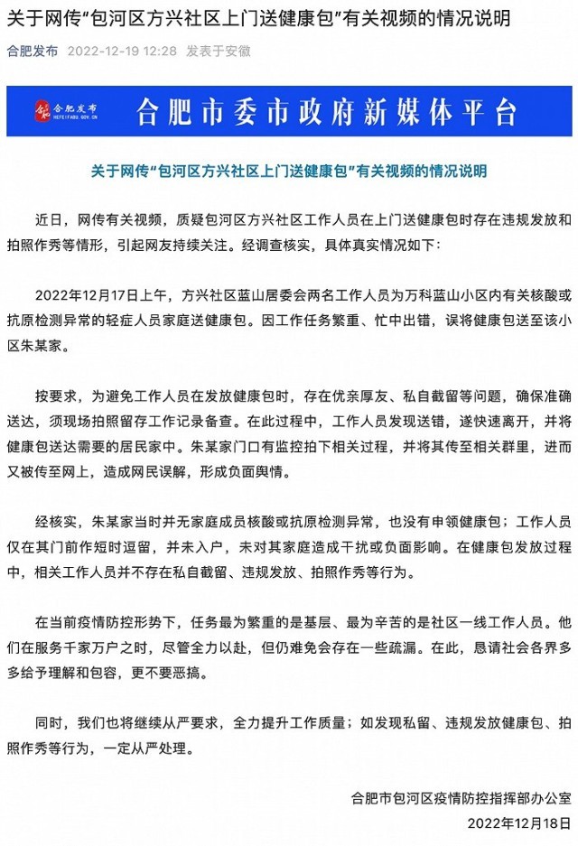 央視網(wǎng)消息:“合肥發(fā)布”微信公眾號12月19日消息,合肥市包河區(qū)疫情防控指揮部辦公室發(fā)布情況說明稱,近日,網(wǎng)傳有關視頻,質(zhì)疑包河區(qū)方興社區(qū)工作人員在上門送健康包時存在違規(guī)發(fā)放和拍照作秀等情形,引起網(wǎng)友持續(xù)關注。經(jīng)調(diào)查核實,具體真實情況如下:
