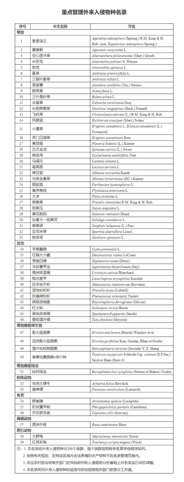 中新網(wǎng)12月20日電 據(jù)農(nóng)業(yè)農(nóng)村部網(wǎng)站20日消息,根據(jù)《中華人民共和國生物安全法》,農(nóng)業(yè)農(nóng)村部會同自然資源部、生態(tài)環(huán)境部、住房和城鄉(xiāng)建設(shè)部、海關(guān)總署和國家林草局組織制定了《重點管理外來入侵物種名錄》,包含鱷雀鱔、美洲牛蛙等59種外來入侵物種?!吨攸c管理外來入侵物種名錄》自2023年1月1日起施行。(中新財經(jīng))