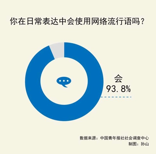數據顯示,93.8%的受訪青年會在日常表達中使用網絡流行語,90后的比例更高(95.9%)。