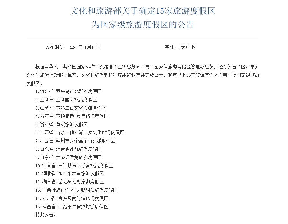 中新網(wǎng)1月11日電 據(jù)文旅部網(wǎng)站顯示,根據(jù)中華人民共和國國家標準《旅游度假區(qū)等級劃分》與《國家級旅游度假區(qū)管理辦法》,經(jīng)有關(guān)省(區(qū)、市)文化和旅游行政部門推薦,文化和旅游部按程序組織認定并完成公示,確定以下15家旅游度假區(qū)為新一批國家級旅游度假區(qū):