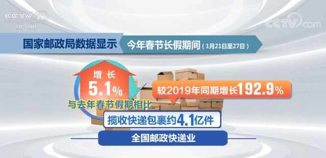 國(guó)家郵政局?jǐn)?shù)據(jù)顯示,今年春節(jié)長(zhǎng)假期間(1月21日至27日),全國(guó)郵政快遞業(yè)攬收快遞包裹約4.1億件,與去年春節(jié)假期相比增長(zhǎng)5.1%,較2019年同期增長(zhǎng)192.9%;投遞快遞包裹3.3億件,與去年春節(jié)假期相比增長(zhǎng)10.0%,較2019年同期增長(zhǎng)254.8%。