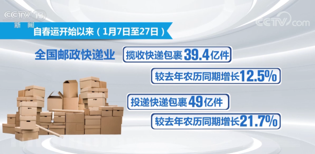數(shù)據(jù)顯示,自春運(yùn)開(kāi)始以來(lái)(1月7日至27日),全國(guó)郵政快遞業(yè)攬收快遞包裹39.4億件,較去年農(nóng)歷同期增長(zhǎng)12.5%;投遞快遞包裹49億件,較去年農(nóng)歷同期增長(zhǎng)21.7%。