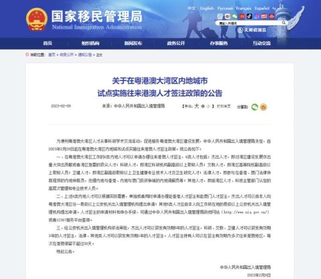 中國青年報客戶端北京2月9日電(中青報·中青網(wǎng)記者 何春中)中華人民共和國出入境管理局2月9日發(fā)布公告,為便利粵港澳大灣區(qū)人才從事科研學(xué)術(shù)交流活動,促進服務(wù)粵港澳大灣區(qū)建設(shè)發(fā)展,自2023年2月20日起在粵港澳大灣區(qū)內(nèi)地城市試點實施往來港澳人才簽注政策。