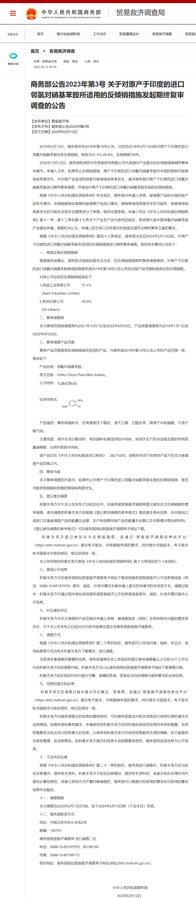 央視網(wǎng)消息:2月12日,商務(wù)部網(wǎng)站發(fā)布公告,決定自2023年2月13日起,對(duì)原產(chǎn)于印度的進(jìn)口鄰氯對(duì)硝基苯胺所適用的反傾銷措施進(jìn)行期終復(fù)審調(diào)查。根據(jù)商務(wù)部建議,國(guó)務(wù)院關(guān)稅稅則委員會(huì)決定,在反傾銷措施期終復(fù)審調(diào)查期間,對(duì)原產(chǎn)于印度的進(jìn)口鄰氯對(duì)硝基苯胺繼續(xù)按照商務(wù)部2018年第19號(hào)公告公布的征稅產(chǎn)品范圍和稅率征收反傾銷稅。