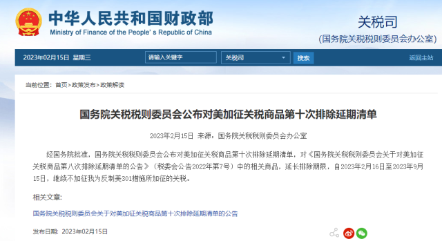 經(jīng)國務院批準,國務院關稅稅則委員會公布對美加征關稅商品第十次排除延期清單,對《國務院關稅稅則委員會關于對美加征關稅商品第八次排除延期清單的公告》(稅委會公告2022年第7號)中的相關商品,延長排除期限,自2023年2月16日至2023年9月15日,繼續(xù)不加征我為反制美301措施所加征的關稅。