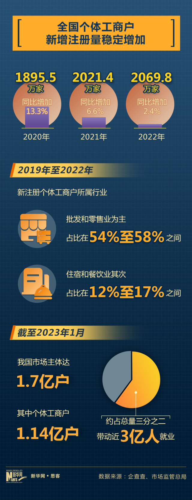 近日市場監(jiān)管總局統(tǒng)計(jì)顯示,截至2023年1月,我國市場主體達(dá)1.7億戶,其中個(gè)體工商戶1.14億戶,約占總量三分之二,帶動近3億人就業(yè)。