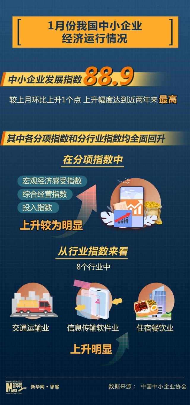 近日中國中小企業(yè)協(xié)會公布我國中小企業(yè)經(jīng)濟(jì)運(yùn)行情況。2023年1月份,中國中小企業(yè)發(fā)展指數(shù)為88.9,比去年12月回升1個(gè)點(diǎn),上升幅度達(dá)到近兩年來最高。其中,企業(yè)發(fā)展信心回升,反映企業(yè)信心狀況的宏觀經(jīng)濟(jì)感受指數(shù)為98.7,比上月上升2.1點(diǎn)。市場預(yù)期有所提振,市場指數(shù)為80.7,環(huán)比上升0.9點(diǎn)。