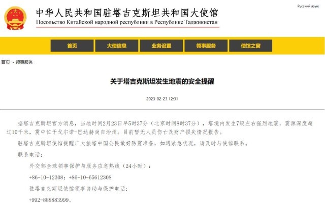 駐塔吉克斯坦使館提醒廣大旅塔中國公民做好防震準(zhǔn)備,如遇緊急狀況,請及時與使館聯(lián)系。