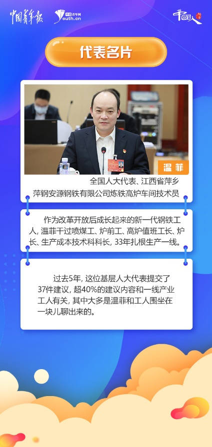 作為改革開放后成長起來的新一代鋼鐵工人,溫菲干過噴煤工、爐前工、高爐值班工長、爐長、生產(chǎn)成本技術(shù)科科長,33年扎根生產(chǎn)一線。過去5年,這位基層人大代表提交了37件建議,超40%的建議內(nèi)容和一線產(chǎn)業(yè)工人有關(guān),其中大多是溫菲和工人圍坐在一塊兒聊出來的。