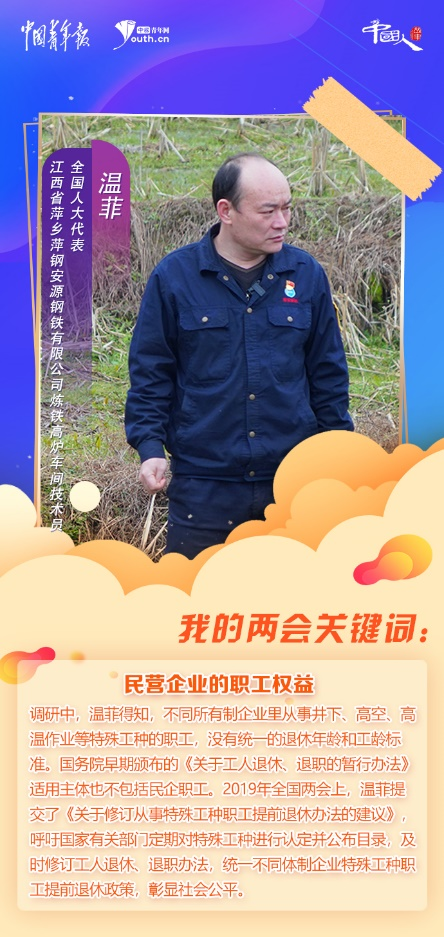 民營企業(yè)的職工權(quán)益,一直是溫菲關(guān)注的焦點。調(diào)研中,溫菲得知,不同所有制企業(yè)里從事井下、高空、高溫作業(yè)等特殊工種的職工,沒有統(tǒng)一的退休年齡和工齡標(biāo)準(zhǔn)。國務(wù)院早期頒布的《關(guān)于工人退休、退職的暫行辦法》適用主體也不包括民企職工。2019年全國兩會上,溫菲提交了《關(guān)于修訂從事特殊工種職工提前退休辦法的建議》,呼吁國家有關(guān)部門定期對特殊工種進行認定并公布目錄,及時修訂工人退休、退職辦法,統(tǒng)一不同體制企業(yè)特殊工種職工提前退休政策,彰顯社會公平。