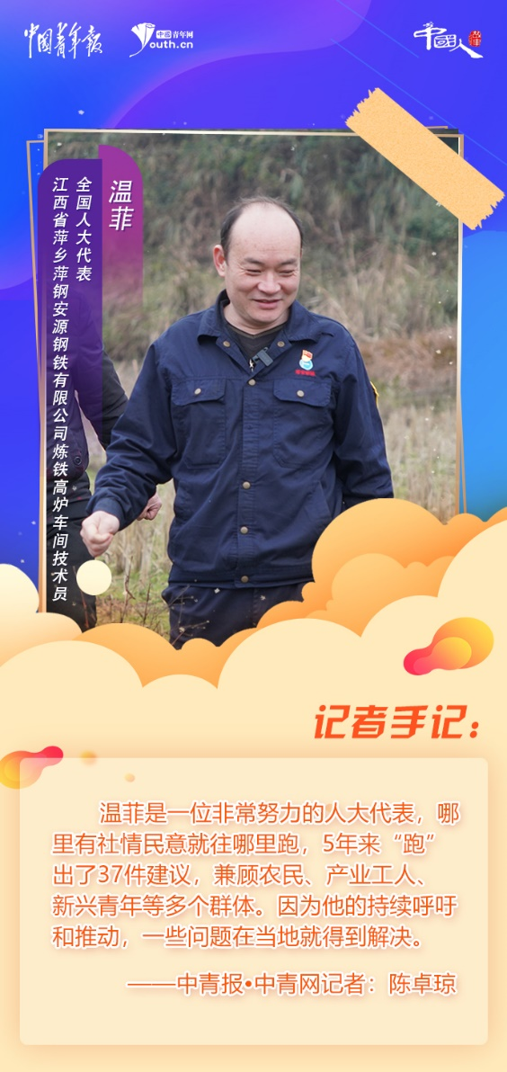 溫菲是一位非常努力的人大代表,哪里有社情民意就往哪里跑,5年來“跑”出了37件建議,兼顧農(nóng)民、產(chǎn)業(yè)工人、新興青年等多個群體。因為他的持續(xù)呼吁和推動,一些問題在當(dāng)?shù)鼐偷玫浇鉀Q。