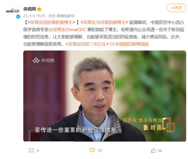 疫情期間,吳尊友兼職做起了博主。他希望向公眾傳遞一些關(guān)于新冠疫情的防控信息,讓大家能夠理解,也能夠采取適當(dāng)?shù)姆酪叽胧?,減少感染風(fēng)險(xiǎn)。此外,也能更理解國(guó)家政策。