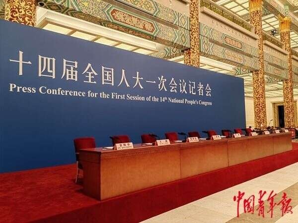 十四屆全國人大一次會議記者會現(xiàn)場,9把紅色靠背的椅子,正在等待今天記者會的主角。 中青報·中青網(wǎng)記者 邱晨輝/攝