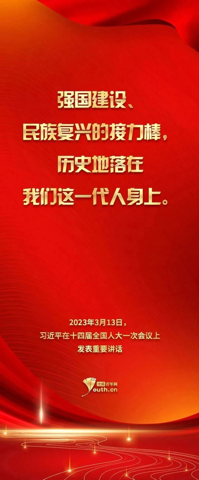 主講人:青年朋友們大家好,我是來(lái)自東北林業(yè)大學(xué)馬克思主義學(xué)院的于冰。3月13日,習(xí)近平主席在十四屆全國(guó)人大一次會(huì)議上發(fā)表重要講話指出,強(qiáng)國(guó)建設(shè)、民族復(fù)興的接力棒,歷史地落在我們這一代人身上。我們今天圍繞這一主題展開(kāi)學(xué)習(xí)。首先,咱們來(lái)學(xué)習(xí)體悟習(xí)主席講話中的一些金句。