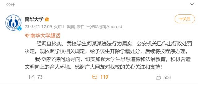 央視網(wǎng)消息:據(jù)@南華大學(xué) 微博最新消息,經(jīng)調(diào)查核實(shí),該校學(xué)生何某某違法行為屬實(shí),公安機(jī)關(guān)已作出行政處罰決定?,F(xiàn)依照學(xué)校相關(guān)規(guī)定,給予該生開除學(xué)籍處分,后續(xù)將按程序辦理。