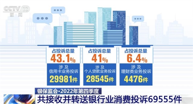 2022年第四季度,中國(guó)銀保監(jiān)會(huì)及其派出機(jī)構(gòu)共接收并轉(zhuǎn)送銀行業(yè)消費(fèi)投訴69555件。其中,涉及信用卡業(yè)務(wù)投訴29981件,占投訴總量的43.1%;涉及個(gè)人貸款業(yè)務(wù)投訴28545件,占投訴總量的41%;涉及理財(cái)類業(yè)務(wù)投訴4476件,占投訴總量的6.4%。