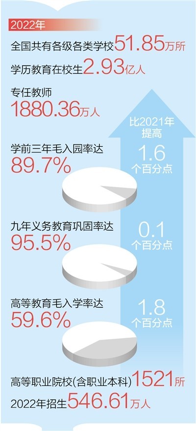 ——普及鞏固水平進一步提升。全國學(xué)前三年毛入園率達到89.7%,比2021年提高1.6個百分點;九年義務(wù)教育鞏固率達95.5%,高中階段毛入學(xué)率達到91.6%。