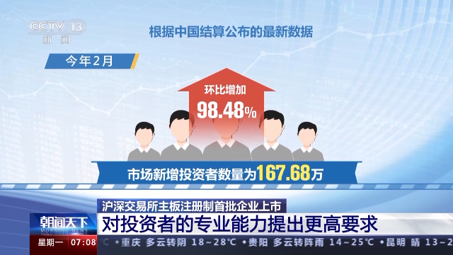 根據(jù)中國結(jié)算公布的最新數(shù)據(jù),今年2月,市場新增投資者數(shù)量為167.68萬,環(huán)比增加98.48%,這是時(shí)隔4個(gè)月之后,市場單月新增投資者數(shù)量再次超過百萬。截至2月末,我國A股投資者已達(dá)到2.14億。專家表示,全面實(shí)行注冊制,一些市場規(guī)則隨之調(diào)整,投資者需要審慎進(jìn)行判斷。