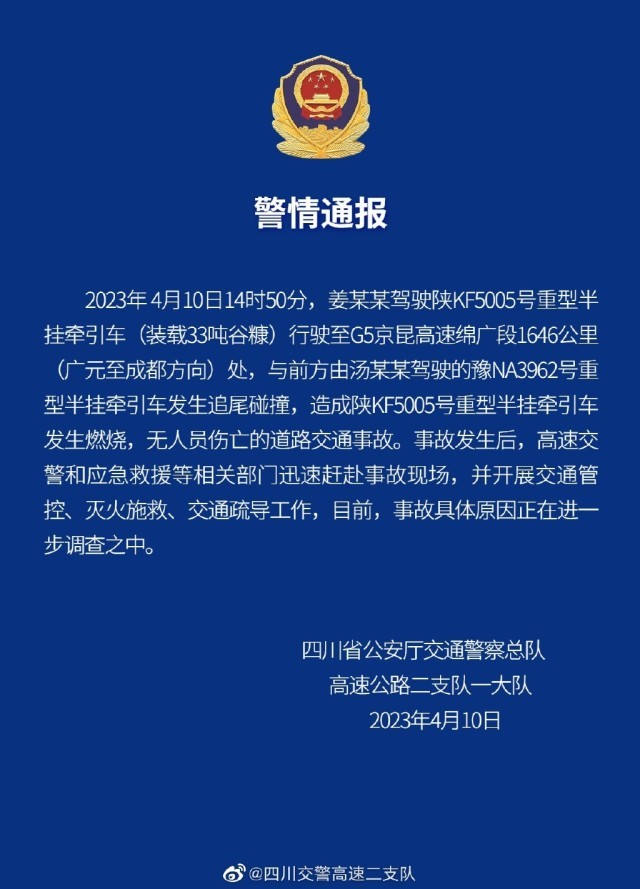 央視網(wǎng)消息:據(jù)@四川交警高速二支隊微博通報,4月10日14時50分,姜某某駕駛陜KF5005號重型半掛牽引車(裝載33噸谷糠)行駛至G5京昆高速綿廣段1646公里(廣元至成都方向)處,與前方由湯某某駕駛的豫NA3962號重型半掛牽引車發(fā)生追尾碰撞,造成陜KF5005號重型半掛牽引車發(fā)生燃燒,無人員傷亡的道路交通事故。事故發(fā)生后,高速交警和應急救援等相關部門迅速趕赴事故現(xiàn)場,并開展交通管控、滅火施救、交通疏導工作,目前,事故具體原因正在進一步調(diào)查之中。